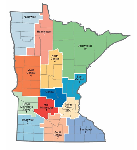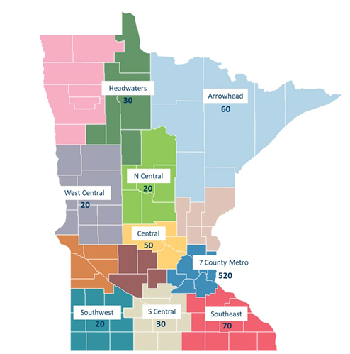 CHWs work in many settings throughout the entire state of Minnesota. The 2024 Environmental Scan (linked above) found CHWs working in 11 settings including, “community organizations, local health departments, managed care plans, mental-health centers, long term care facilities, and health systems”. The scan also found that CHWs are working in over half of Minnesota counties (47). Below are some maps that were included in the 2024 Environmental Scan.